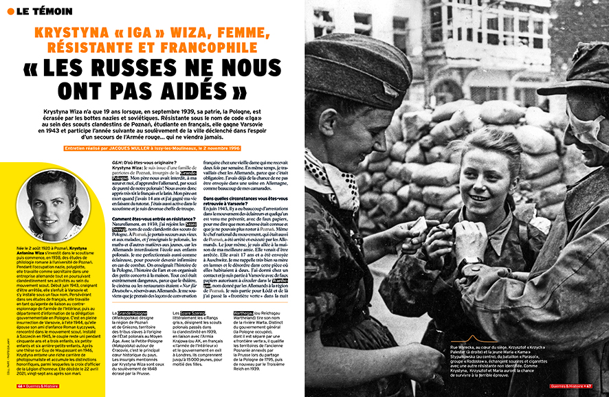 Krystyna Wiza n’a que 19 ans lorsque, en septembre 1939, sa patrie, la Pologne, est écrasée par les bottes nazies et soviétiques. Résistante sous le nom de code « Iga » au sein des scouts clandestins de Poznan, étudiante en français, elle gagne Varsovie en 1943 et participe l’année suivante au soulèvement de la ville déclenché dans l’espoir d’un secours de l’Armée rouge… qui ne viendra jamais. Entretien réalisé par JACQUES MULLER