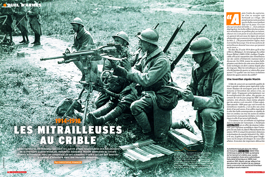 Après l’artillerie, les mitrailleuses sont les autres armes responsables des hécatombes de la Première Guerre mondiale. Hotchkiss française, Maxim allemande ou encore Vickers britannique : voici un comparatif de ces « moulins à café » qui ont fait basculer le combat d’infanterie dans une nouvelle dimension. Par CHRISTOPHE POMMIER