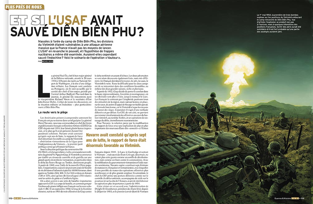 Massées à l’orée du camp de Diên Biên Phu, les divisions du Vietminh étaient vulnérables à une attaque aérienne massive que la France n’avait pas les moyens de lancer. L’USAF en revanche le pouvait, et l’hypothèse de frappes nucléaires a même été examinée. Auraient-elles cependant sauvé l’Indochine ? Voici le scénario de l’opération « Vautour ». Par Michel Goya